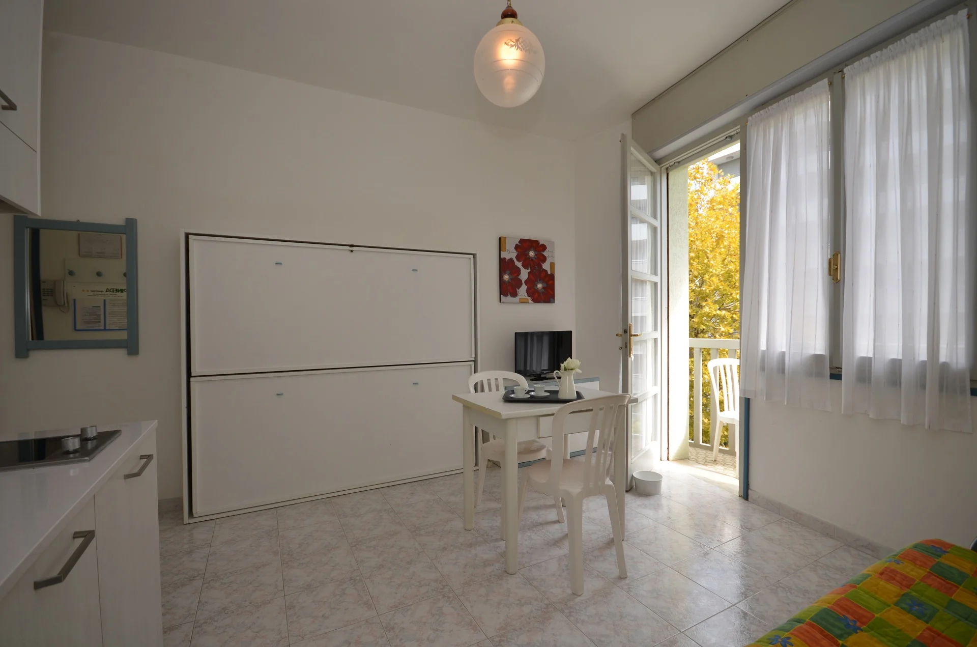 Monolocale con 4 posti letto composto da vano adibito a soggiorno con divano letto doppio + letto a castello estraibile, angolo cottura, bagno e poggiolo.